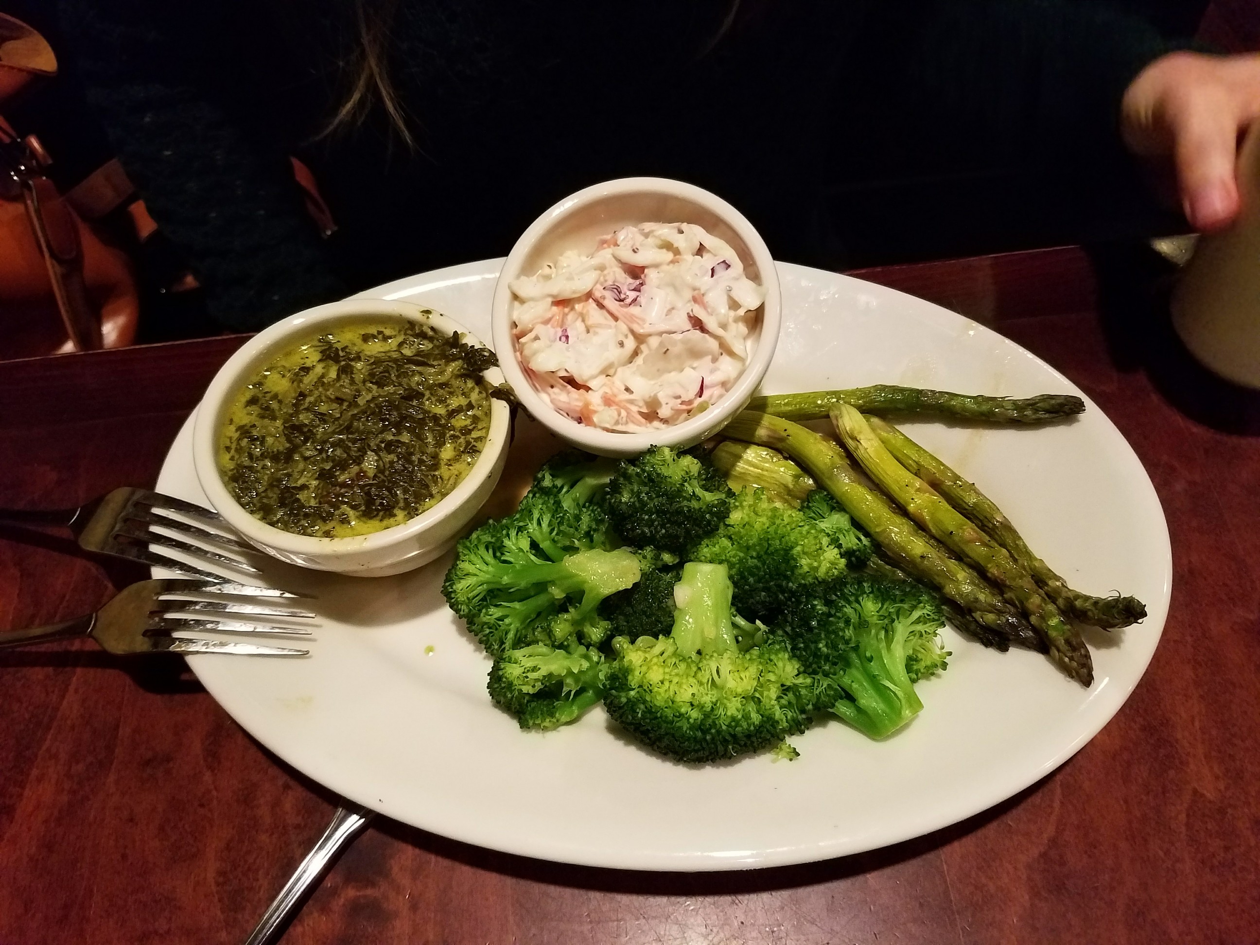2017-11-10 20.57.46 My plate with creamed spinach, broccoli with butter and lemon, asparagus, and coleslaw!